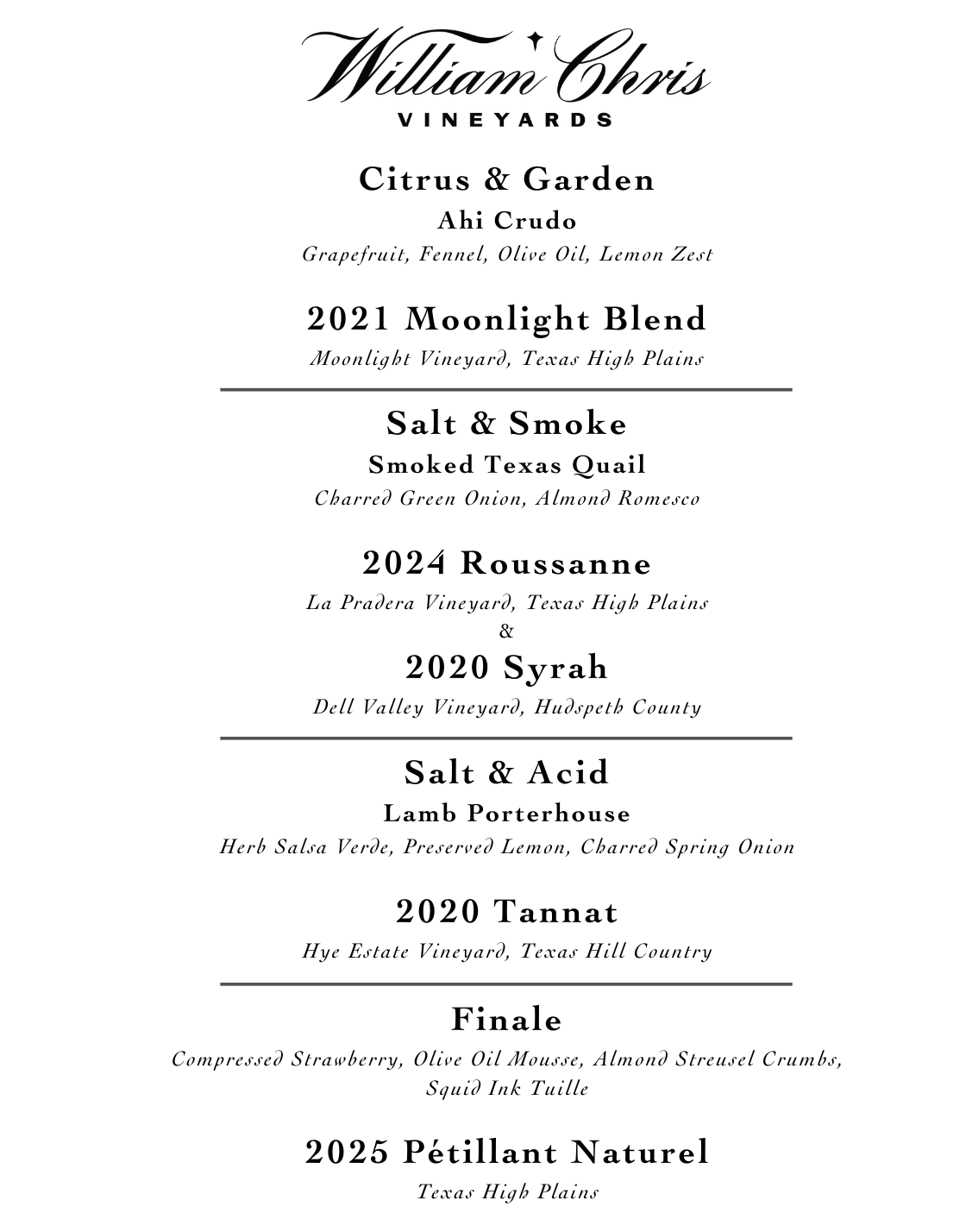 For parties larger than 6, please contact our team by emailing reservations@williamchriswines.com or calling our concierge team at 830.998.7654 so that we may accommodate your party.